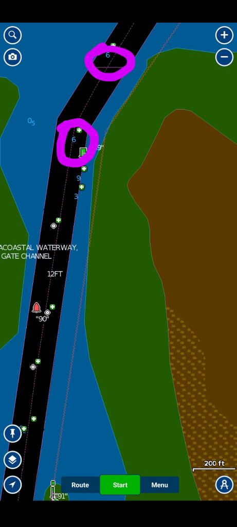 We made a good decision to wait until this morning’s high tide to get through Hell Gate. The rising tide also kept us from bumping on our way out of Redbird Creek.