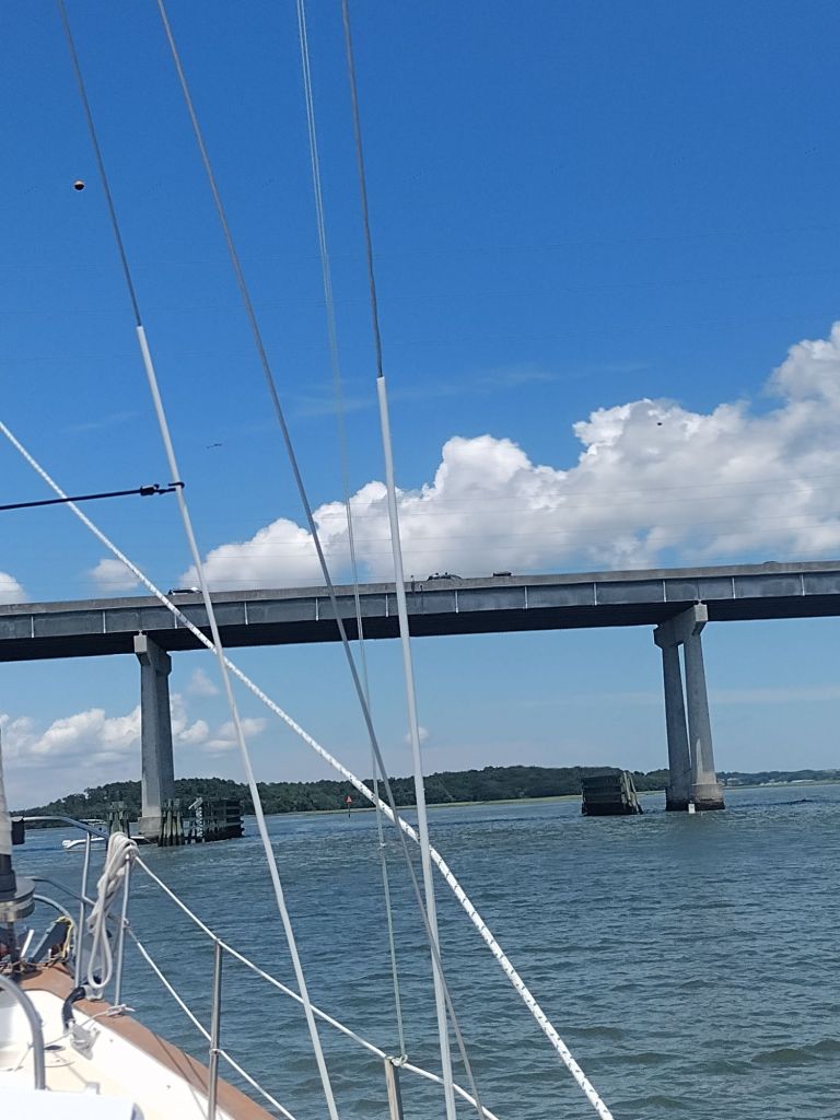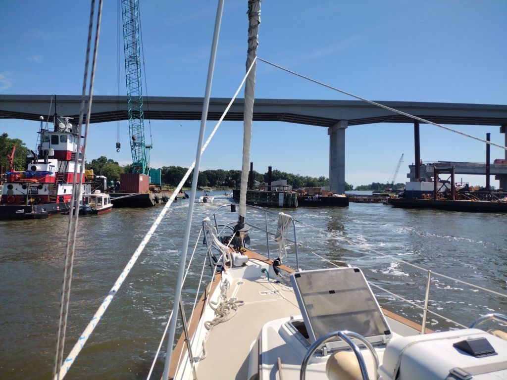 Summer Saturdays on the water are really busy. It’s very noticeable in places with construction, like the Causton Bluff Bridge. There’s a narrow channel in between barges and an anchored tug that all marine traffic has to use.