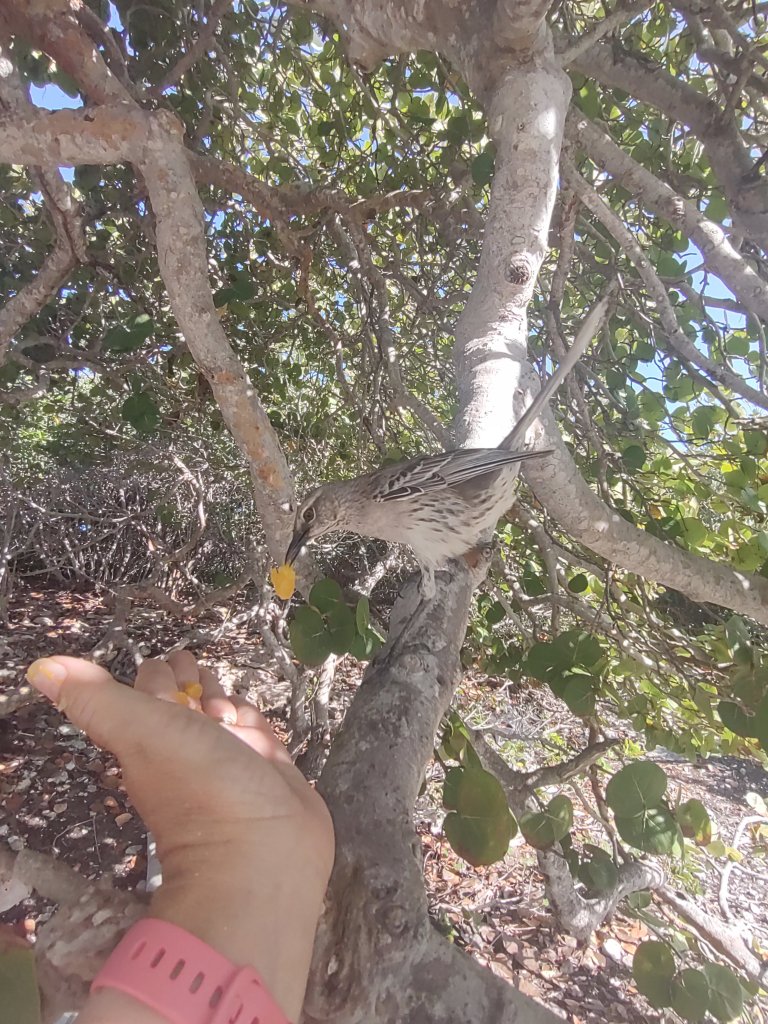 We dinghied the short distance to meet our friends (two couples). There’s iguanas everywhere! We brought carrots to feed them…but the highlight for me was feeding the Bahamas mockingbirds. They took orange chunks from my hand. Nature nerd was in her glory!