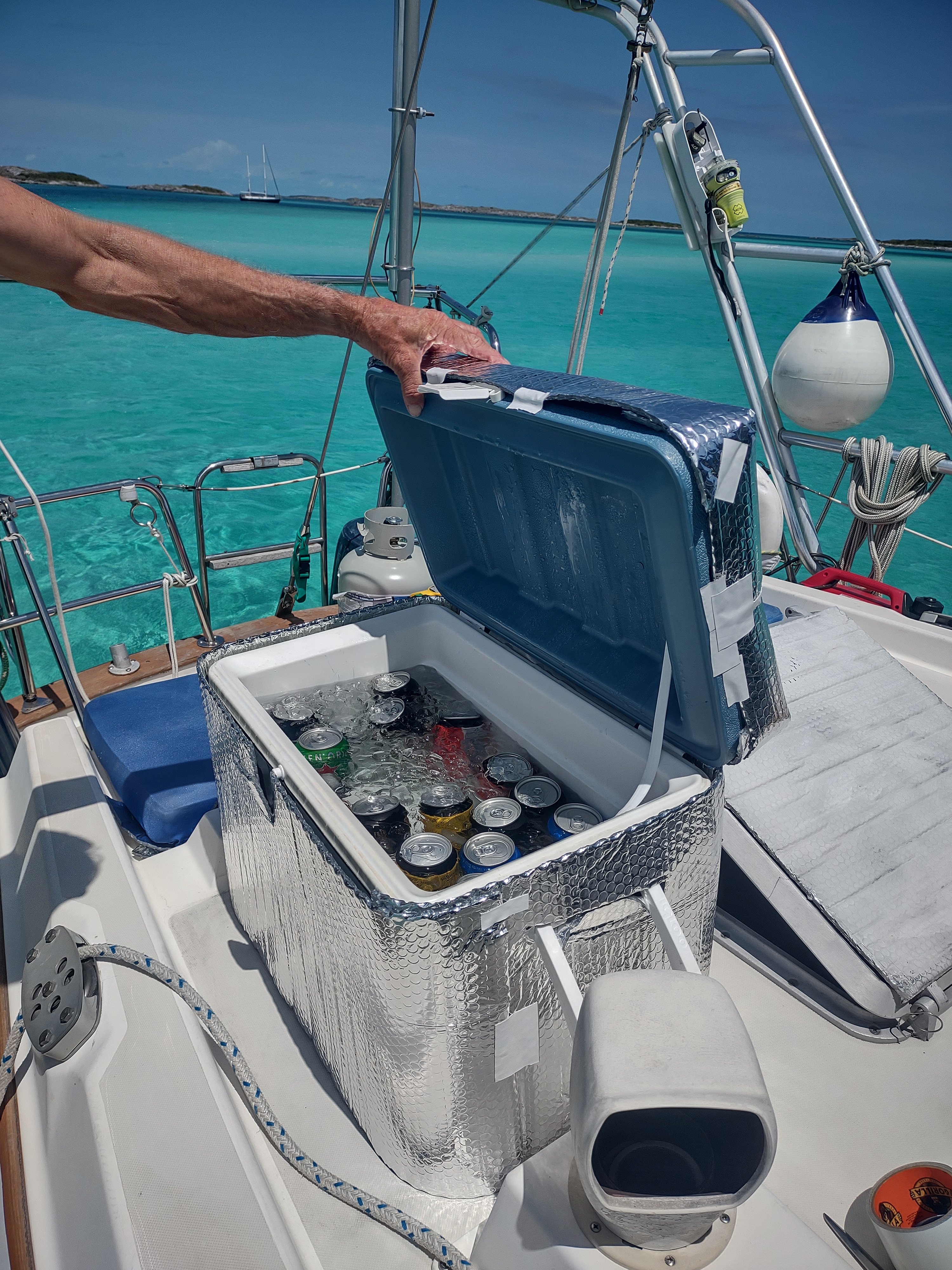 We use an igloo cooler to keep our beverages cold (as long as we can buy ice). It’s on our stern so it’s in the sun all day long. Today we decided to create an insulated cover for it. We have a roll of the silver bubble wrap stuff that’s often used in car windshield protectors that we use to cover our deck hatches. It was the perfect material for the cooler cover.