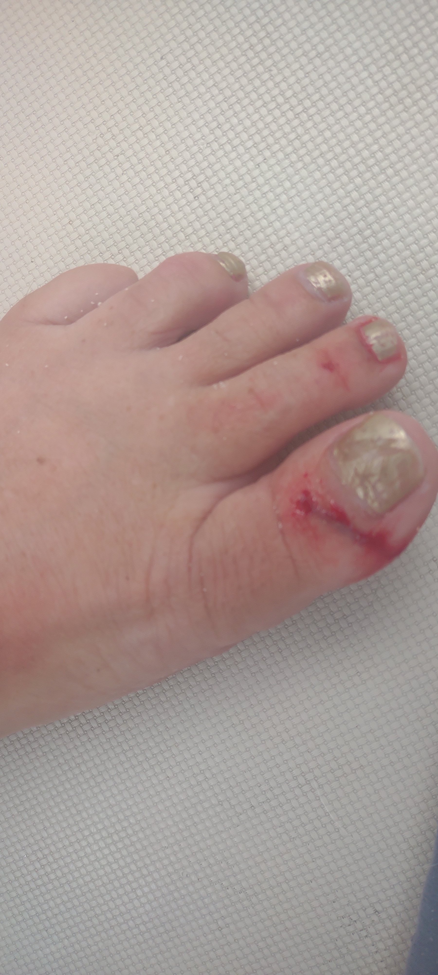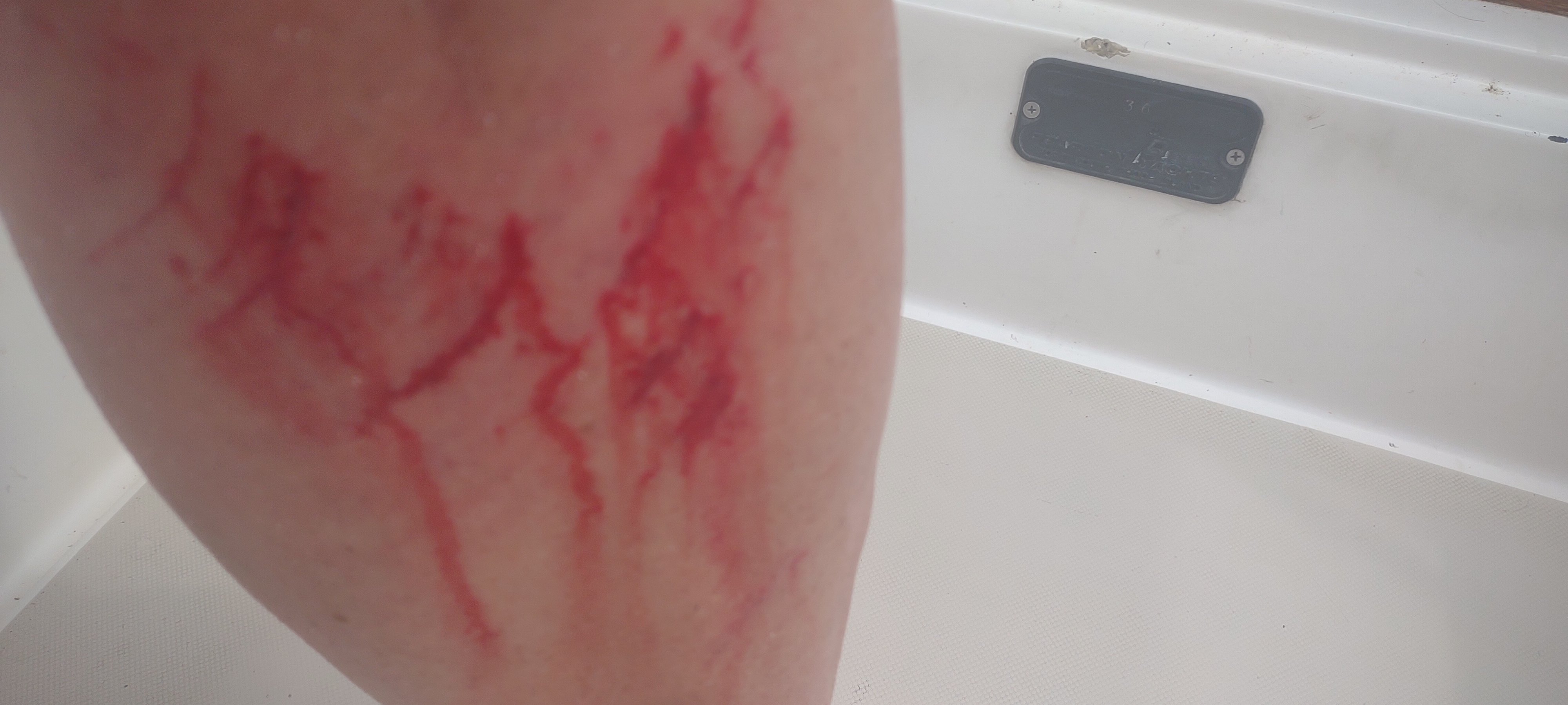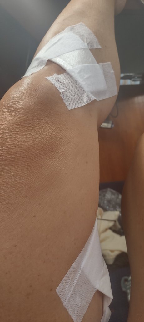 We have a lot of first aid supplies so once I cleaned off all of the blood and sand (I am tall enough to get my foot and shin in the sink, then I hoisted myself up to get my inner thigh clean) I was Neosporin-ed and bandaged up. We have cloth tape so I didn’t have to use gorilla tape.
